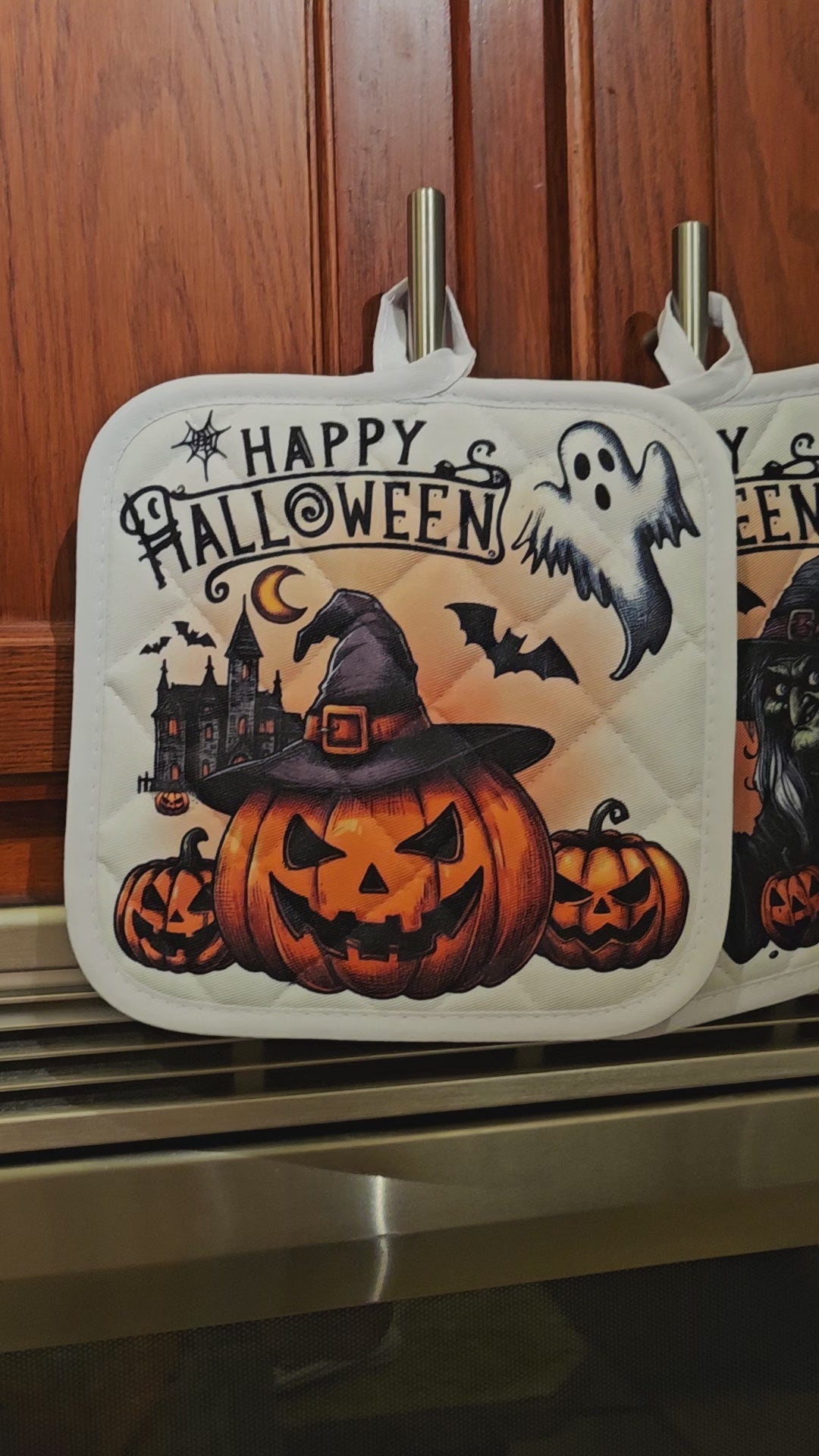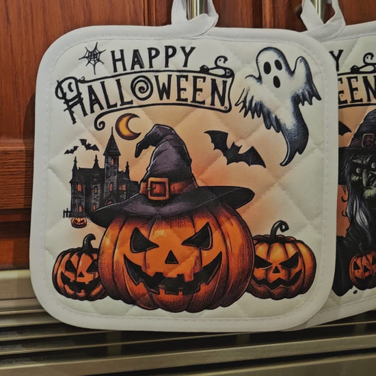 Get ready for spooky season with these Happy Halloween potholders! Heat resistant and washable, they keep you safe while adding a playful touch to your kitchen. Perfect for handling hot treats and protecting surfaces with festive flair.