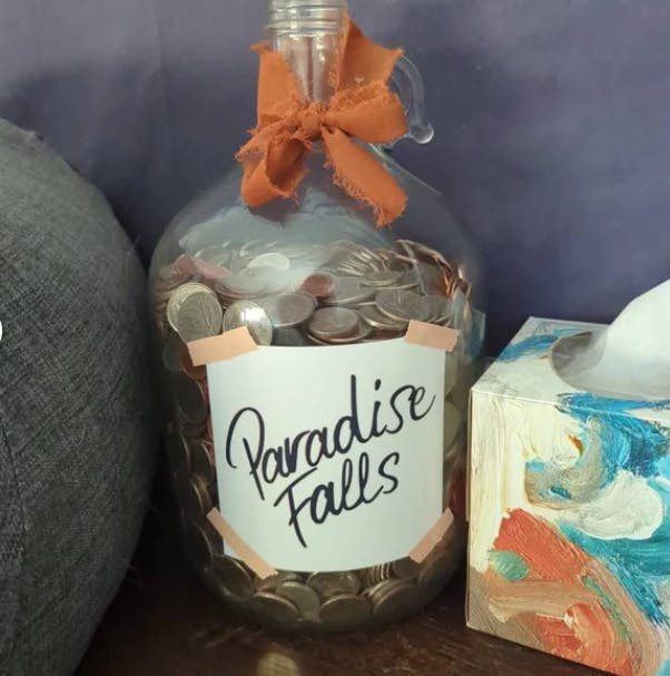 Save up in style with the UP Inspired PARADISE FALLS Label Sign! This quirky money saving jar sticker will not only add a touch of fun to your décor, but will also help you reach your savings goals. (Cha-ching!)