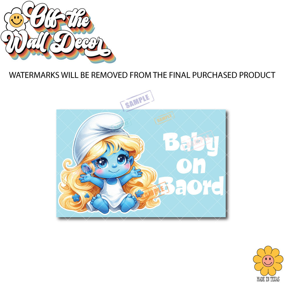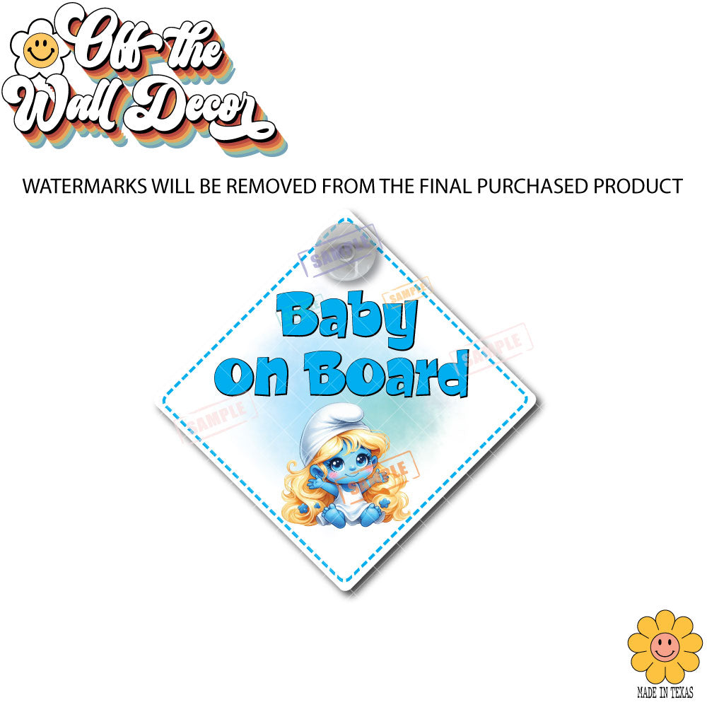 Introducing Little Smurfette, the perfect companion for your little one on car rides! This Cartoon style suction cup sign, magnet or vinyl decal sticker indicates a baby on board, keeping other drivers alert and cautious. It's a fun and playful way to ensure road safety for you and your child.