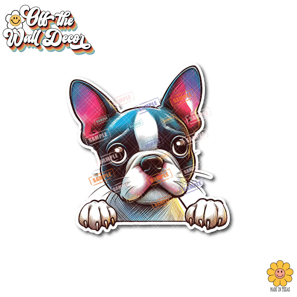 Bring a friendly, fabulous companion on all of your travels with the Peeking Boston! This vinyl sticker of a peeking Boston terrier will give your car window a pup-ular touch, and get you some fetching compliments from your friends. All aboard, let's go! Woof!